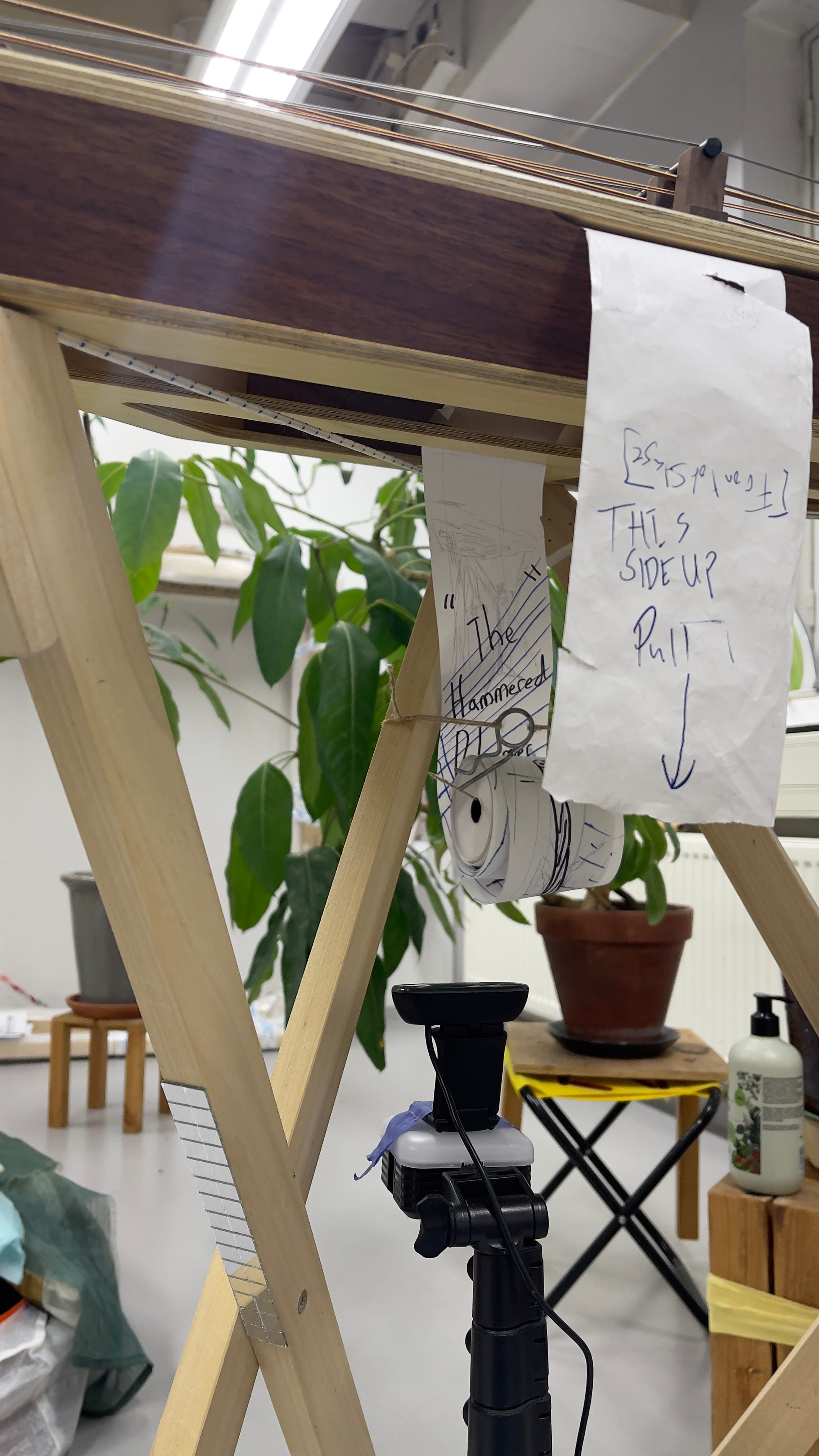 A roll of receipt paper with a bunch of illustrations on it. This is threaded through the inside of the dulcimer. The webcam points up to see this.
